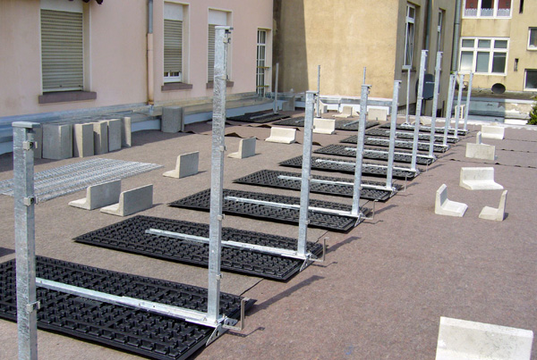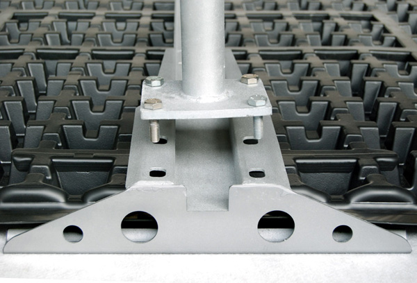 Grundsätzlich ist die Geländerbasis bis zur Oberkante der Systembasis (ca. 43 mm) mit Splitt bzw. Kies zu verfüllen. Bei einem Füllvolumen von 15–16 l/m² entspricht dies einer Auflast von ca. 25 kg/m². Die Auflast kann in Form eines Plattenbelags im mindestens 50 mm hohen Splittbett, mit einem entsprechendem Begrünungsaufbau, Kies oder mit einem anderen, gleichwertigen Schüttgut erfolgen.