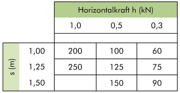 Die erforderliche Auflast in nachstehender Tabelle ist für die Geländerbasis GB in Abhängigkeit von der geforderten Horizontalkraft (h) und Pfostenabstand (s). Ist die Windlast größer als die geforderte Holmlast, so ist diese für die Ermittlung der erforderlichen Auflast anzusetzen. Vor dem Aufbringen der erforderlichen Auflast, empfehlen wir alle Verbindungen und die Lage des Geländers zu überprüfen.