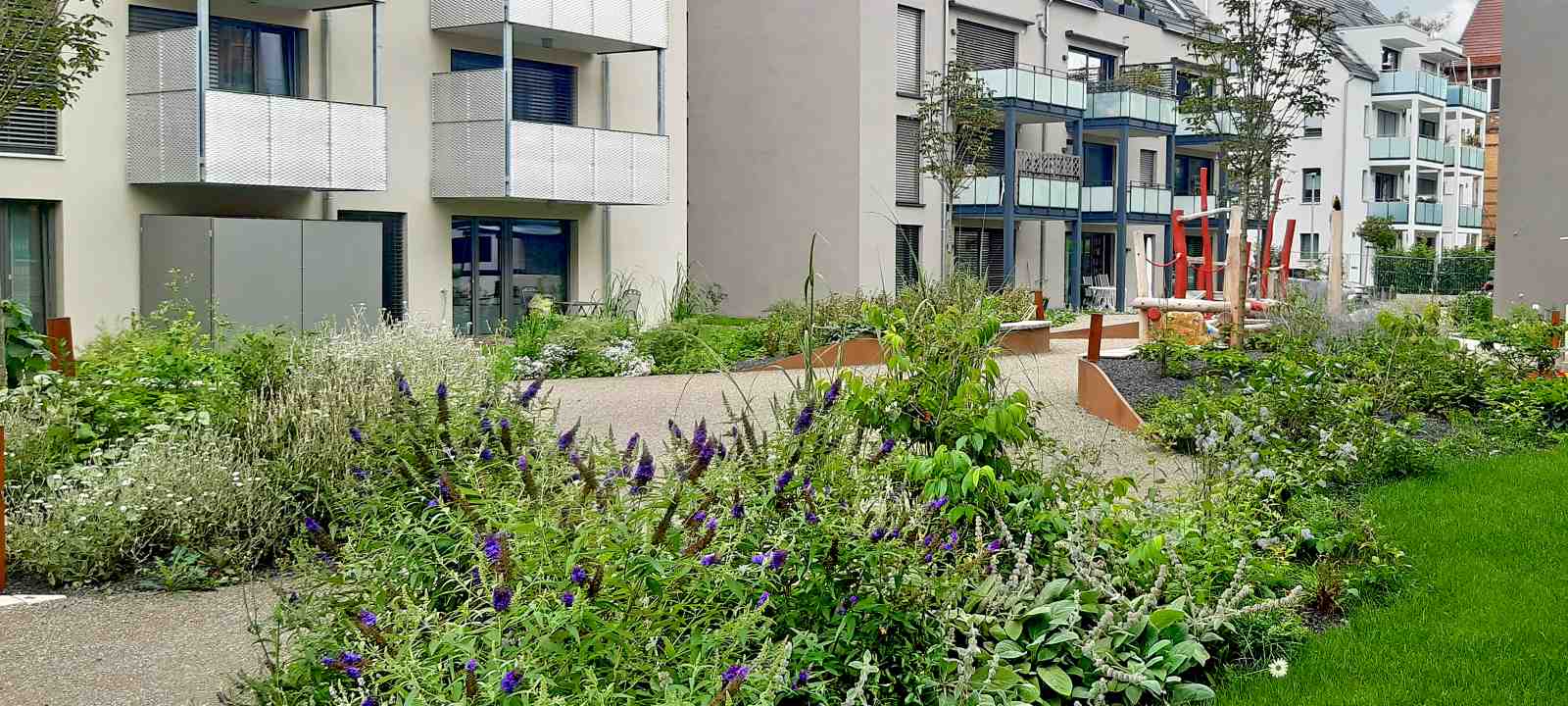 Die vielseitigen Grünflächen der Tiefgarage machen das Steingauquartier zum attraktiven Wohnumfeld.